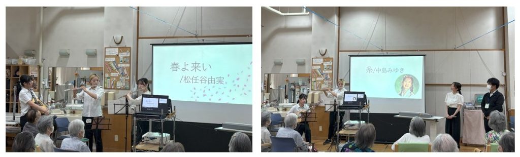 9月8日に、4回生の在宅看護論実習でお世話になっているデイサービス「わかば」さんで、4回生の有志が演奏会を開催しました。下記はフルート、マンドリン、キーボードでの演奏風景です。
